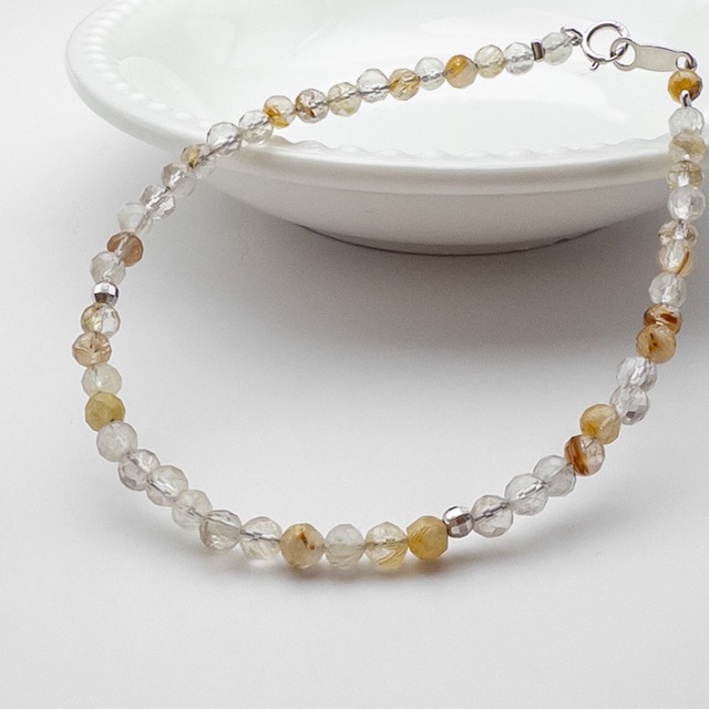 2mmビーズから3mmビーズに変更です 金銭や仕事の石ルチルクォーツ 小さくて透明で、針が綺麗なお石が入りましたので 細身のブレスレットに。 ルチルクォーツのブレスというと大玉ギラギラ~をイメージされる方も多いかも。 こちらはさらりと身に着けられるブレスレットです! 針の入り方、量は全てランダム。 基本金色の針が入っていますが、ブラウン系もございます。 また黒いポチっとした内包物は「ルチルの種」ヘマタイトです 少しの違いが楽しいブレスレットになりました ワイヤーはナイロンコート 引き輪などの金属パーツはシルバー925、金色のパーツはステンレスを使用しました。 とても華奢ですが、キラキラと存在感のある1本です。 天然石を使用しておりますので、表面に細かな傷、 内部のクラック、お石由来の内包物がございます 実物のお色味に合わせておりますが、お使いの環境により若干見え方が違う場合がございます。 ・‥…━…‥・‥…━…‥・‥…━…‥・‥…━…‥・‥… *金色の線が「金銭」を意味する ルチルクォーツ 水晶の中に針、線が入ったものをルチルクォーツと呼びます。 様々なお色の針が存在する中で、金色の針のものを一般的にルチルクォーツ ゴールドルチルクォーツと呼びます。 「金の線」を「金銭」になぞらえお守りとして愛されています。 ・‥…━…‥・‥…━…‥・‥…━…‥・‥…━…‥・‥… 使用石 ルチルクォーツ 約3mm前後 金属パーツ SV925 サイズ 全長 約18cm ※内径ではありませんのでご注意ください。 その他ご質問などございましたら お気軽にお問い合わせくださいませ。
