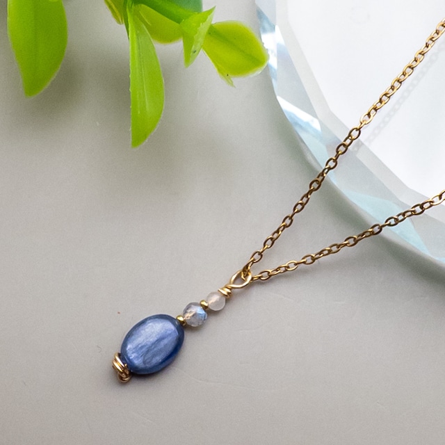 地球の青 カイヤナイトに 夜空のようなラブラドライト 月の石 ムーンストーンを添えた 縦ラインのペンダントです カイヤナイト独特の繊維質な輝きと色ムラがございます。 色ムラ、模様の入り方は全て異なります。 表面、穴付近に原石由来の小さな傷や欠けがある場合がございます。 予めご理解ください。 お写真はお届けするお品の一部を撮影しております 天然石を使用しておりますので、表面に細かな傷、 内部のクラック、お石由来の内包物がございます 実物のお色味に合わせておりますが、お使いの環境により若干見え方が違う場合がございます。 ・‥…━…‥・‥…━…‥・‥…━…‥・‥…━…‥・‥… *固定概念を無くし、世界観を確立するカイヤナイト カイヤナイトは依存心や甘えを無くし、独立心や探究心を強めるといわれています。 また、固定概念を外し悪習慣を遠ざけることによって、持つ人の世界観を確立する事を助ける石として知られています。 明晰な思考力や、判断力を高めるエネルギーを持ち、研究者や物事を探求し続けていくような仕事をされている方に特におすすめのカイヤナイト。 新しい自分を見つけたい時、弱点を克服したい時。 仕事場で迷いが生じた時などに身に着けると良いと言われています。 *根気強さを養い、信念を貫くお守り ラブラドライト ラブラドライトの冷たく美しい輝きは、果てしない宇宙を思わせます。 太陽や月、星、惑星などの天体を象徴するといわれるラブラドライトの閃光はラブラドレッセンスと呼ばれ、 1770年にヨーロッパ人によって初めてカナダで発見され、欧州中を驚かせました。 ラブラドライトは、仕事や成功のお石として知られています。 ストレスや悪いエネルギーを良いエネルギーへと循環させバイタリティを引き出すそうです。 何事にも前向きに取り組む力、根気強さと行動力を養い、一度決めた物事、目標、信念を貫く力をサポートしてくれると言われています。 *出会いと恋愛の石 ムーンストーン ふんわりとした乳白色ーが神秘的なムーンストーン。 女性に特に人気のあるお石です。 月の光を宿したようなムーンストーンは、古くから神秘的な力を秘めた石として、人々に愛されてきました。 「月」は女性性の象徴であり、そのエネルギーを持つとされる石です。 また、出逢いと恋愛の石と言われ、持ち主を大きな愛情で満たしてくれるそうです。 愛する人との出逢い、恋愛を成就させ、幸せへと導いてくれるといわれています。 ・‥…━…‥・‥…━…‥・‥…━…‥・‥…━…‥・‥… 使用石 ブラジル産カイヤナイト 約8×6mm前後 ラブラドライト 約3mm前後 ムーンストーン 約2mm前後 ※お石により差がございます トップサイズ 約2cm チェーン 金属:ステンレス / K18GP 長さ:約45cm / 約50cm お選びいただけます サンプルは45cmで撮影しております その他ご質問などございましたら お気軽にお問い合わせくださいませ。