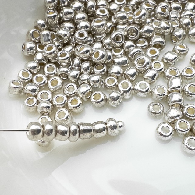 艶があるメタルカラーのガラスシードビーズです。 お写真のようにサイズはMIXです 0.00単位の測りで約30gをパッケージングしています。 約600個入りですが、正確な個数はわかりません。 サンプルで1つ数えたら633個でした カラー:メタルシルバー(プラチナ寄り) サイズ:約3mm前後 穴サイズ 約1mm 大量生産品ですので、若干サイズが異なる場合がございます。 一部穴無しなどの欠損品が混在する場合がございますことをご了承くださいませ。
