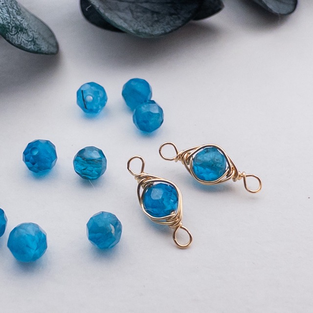 ネオンブルーアパタイト、小さな3mmビーズの ワイヤー巻きパーツです アクセサリー作りやバッグチャーム、その他天然石小物作りに 極小パーツは重宝します お写真はお届けするお品の一部を撮影しております 4個入り1セット販売です 使用石:ネオンブルーアパタイト 約3mm ワイヤー:Artistic Wire / Gold color / 28GA サイズ:約1.1cm前後 若干サイズが異なる場合がございます。 *心を繋げる石 アパタイト アパタイトは「繋げる」という意味を持つお石です。家族の絆や恋人との絆などを繋げ、深めてくれるといわれています。 身に着ける人を中心に、心を繋げていく。 という意味で、チームワークを必要とするお仕事やポジションの方にもおすすめです。 また、心と体を繋げるという意味もあり、不安的な精神を落ち着かせてくれるそうです。 すーっと惹きこまれてしまいそうな神秘的なお色を眺めていると、自然と心が落ち着いてきそうです。 お守りとしては、お子様の健康的な成長のお守りとしても愛されています。 天然石を使用しておりますので、表面に細かな傷、 内部のクラック、お石由来の内包物がございます 実物のお色味に合わせておりますが、お使いの環境により若干見え方が違う場合がございます。 #天然石パーツ #天然石アクセサリー #ブレスレットパーツ #ブレスパーツ #ネックレスパーツ #コネクター #チャーム