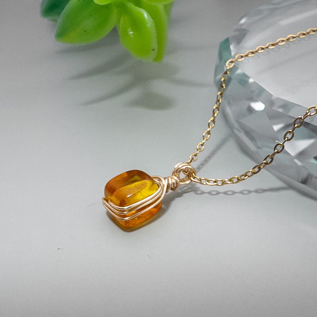 小さいバルティックアンバーをワイヤーで包んだ小さなペンダント