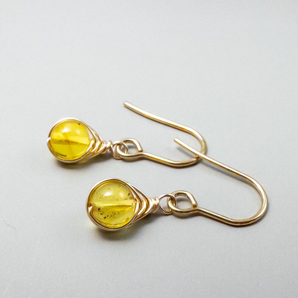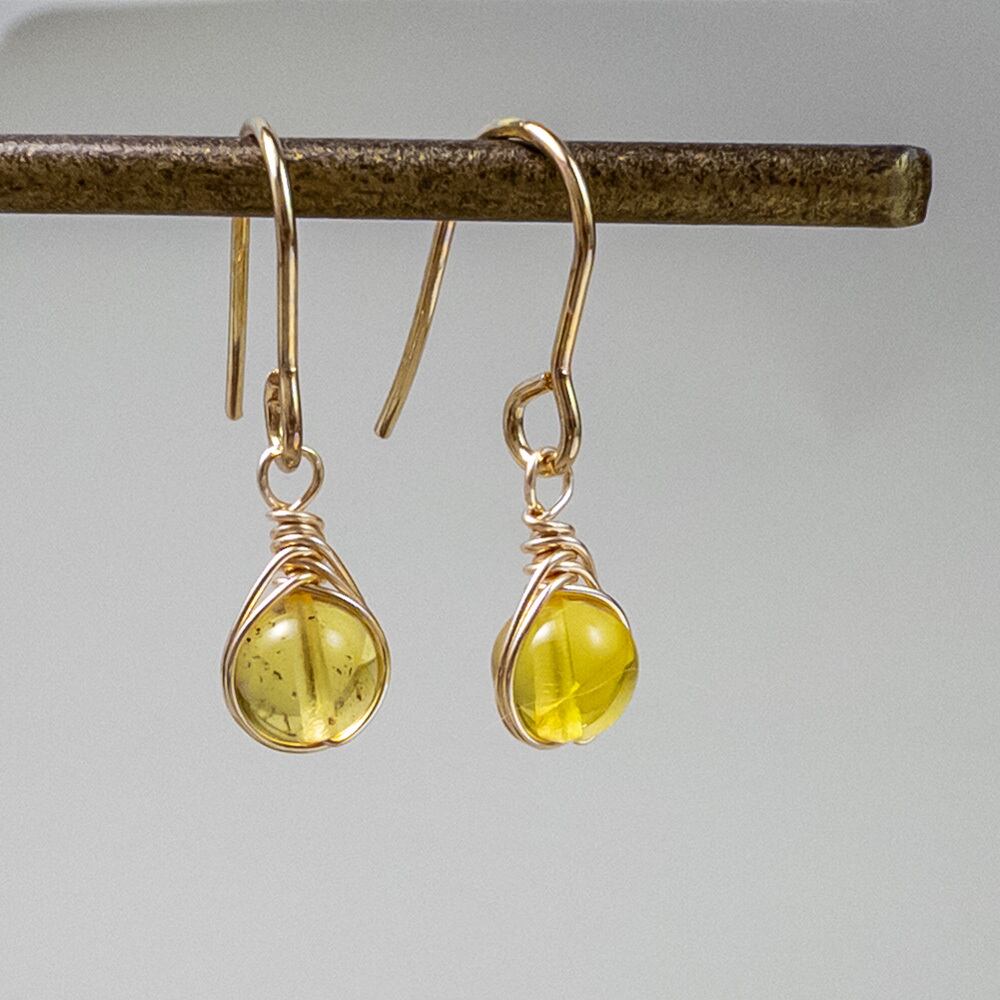 バルティックアンバーをワイヤーで包んだ小さなピアス