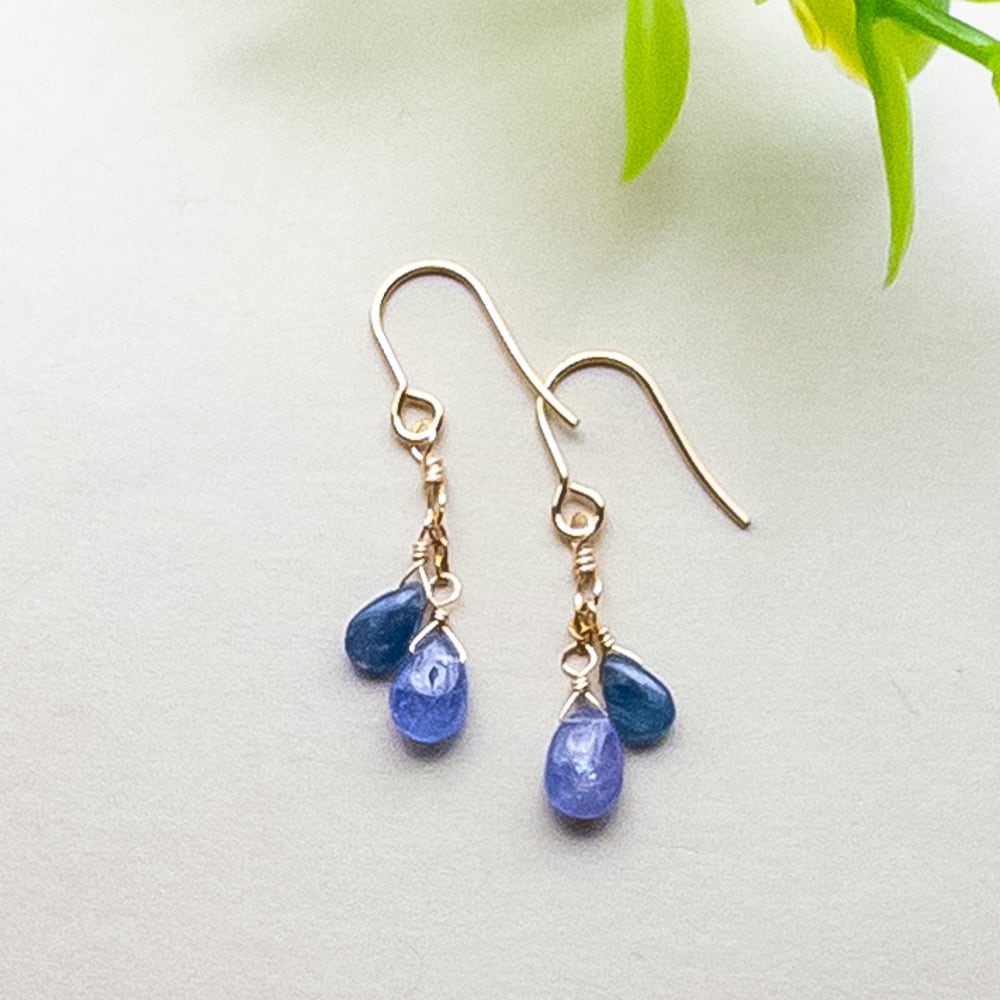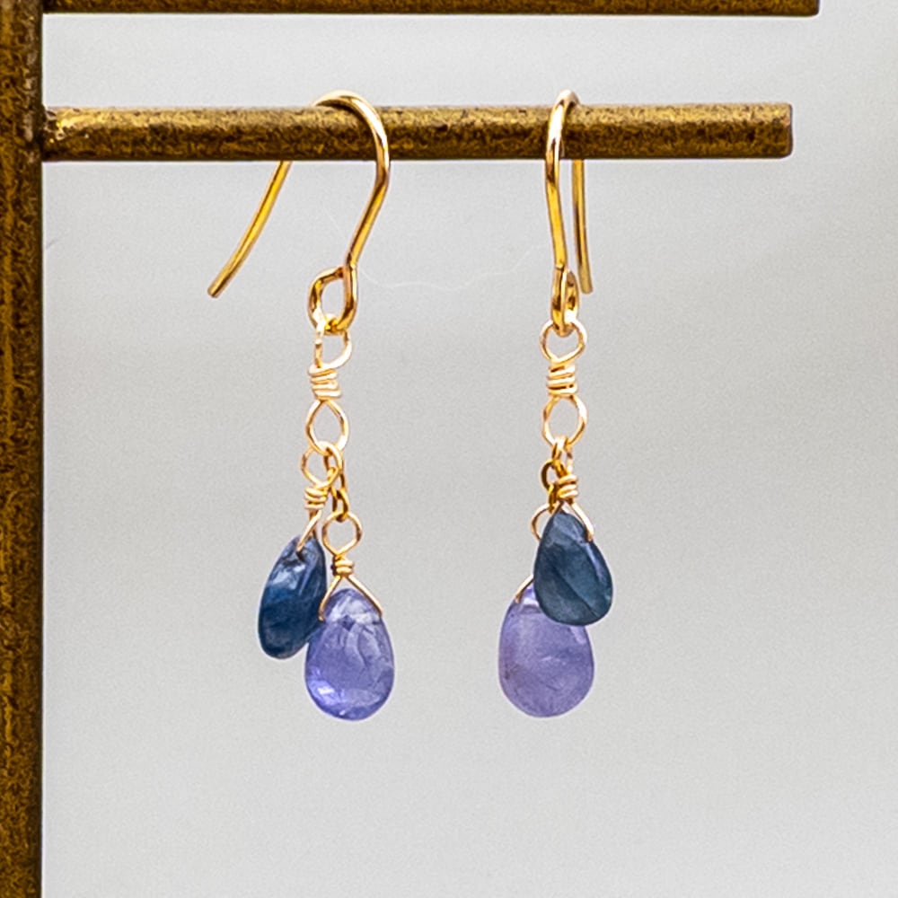 サファイアとタンザナイトをミックスした縦長シルエットで揺れるデザイン。