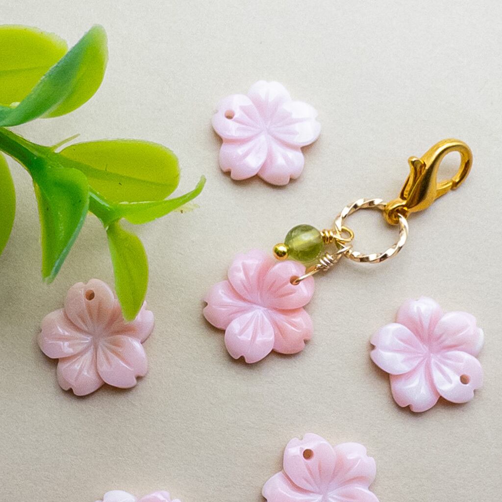 美しさひきだす桜色 クィーンコンクシェル ペリドット チャーム イヤホンジャック 携帯ストラップ変更可 c-395s